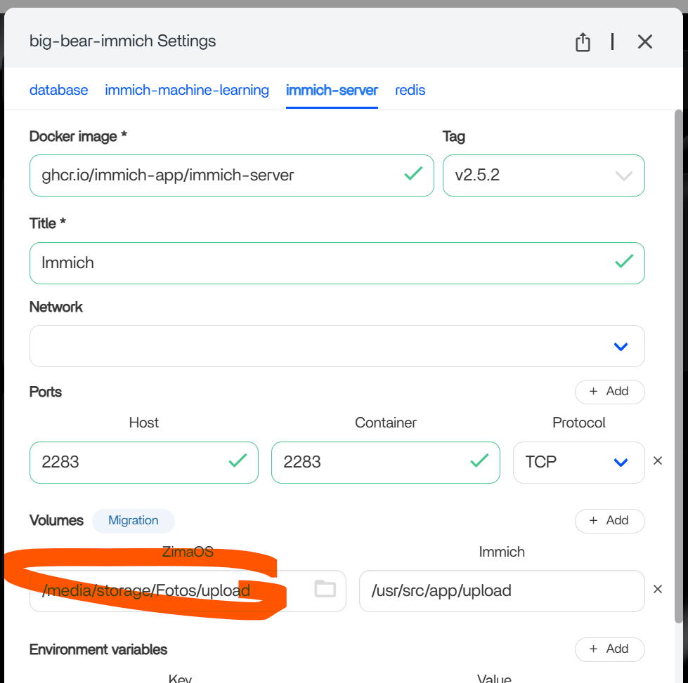 Then I changed the path in “ImmIch Server” as per screenshot - and yet still now Immich won’t start up any more. I put the original settings back - works fine.