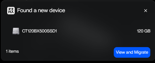 When the USB SSD is completely wiped (Raw/Unallocated, no partition table), ZimaOS correctly detects it and shows a pop-up: “Found a new device” with a prominent blue “View and Migrate” button.