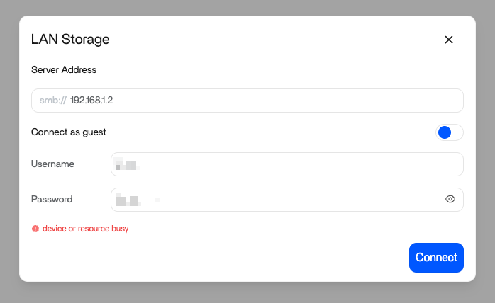 I just installed a fresh ZimaOS VM on proxmox, and have issue to connect to a local SMB shared folder from my NAS (192.168.1.2). When I tried to connect, the system prompts this error “device or resource busy” also confirmed that the credentials are correct and permission is well set. I tried to connect using my old ZimaOS instance (also on Proxmox) and was able to connect.