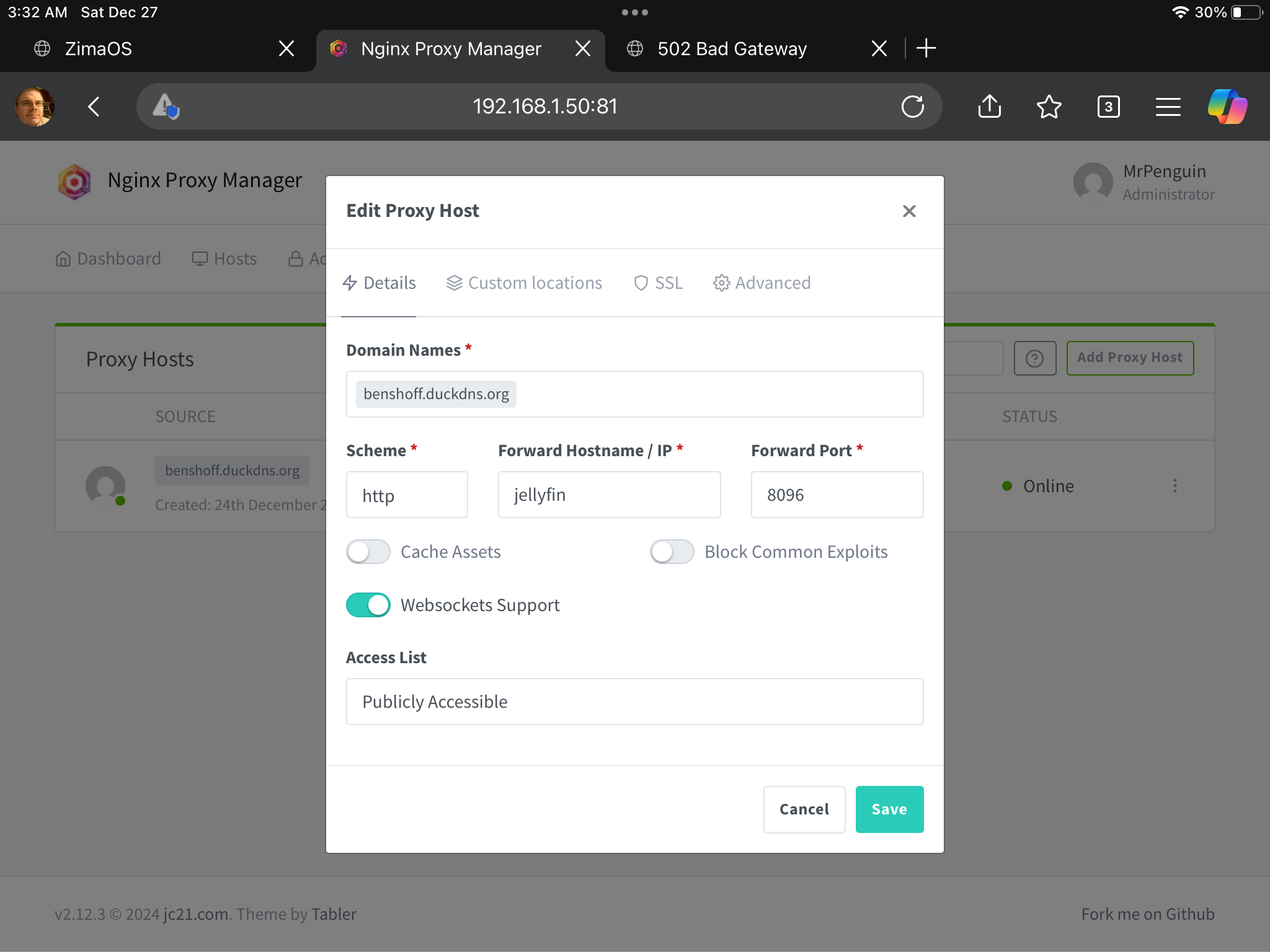 So, since the last writing, everything was good. Or so I thought. We had a power outage that knocked out our internet and killed the Zima os NAS. I then came back to bad gateway for duck dns when going to benshoff.duckdns.org. I saw the ip address changed. So in my mind I am thinking I thought that was supposed to fix itself. So I put it to the current ip address in nginproxy. Now I am back to it going to zimaos again, and not jelly. Also can’t get back into ngin gives me an error on port 81 error.
