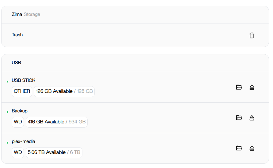 From your screenshot the USB drives are mounted correctly at the OS level (green status, capacity shown), so the issue is very likely container-side access, not storage failure.