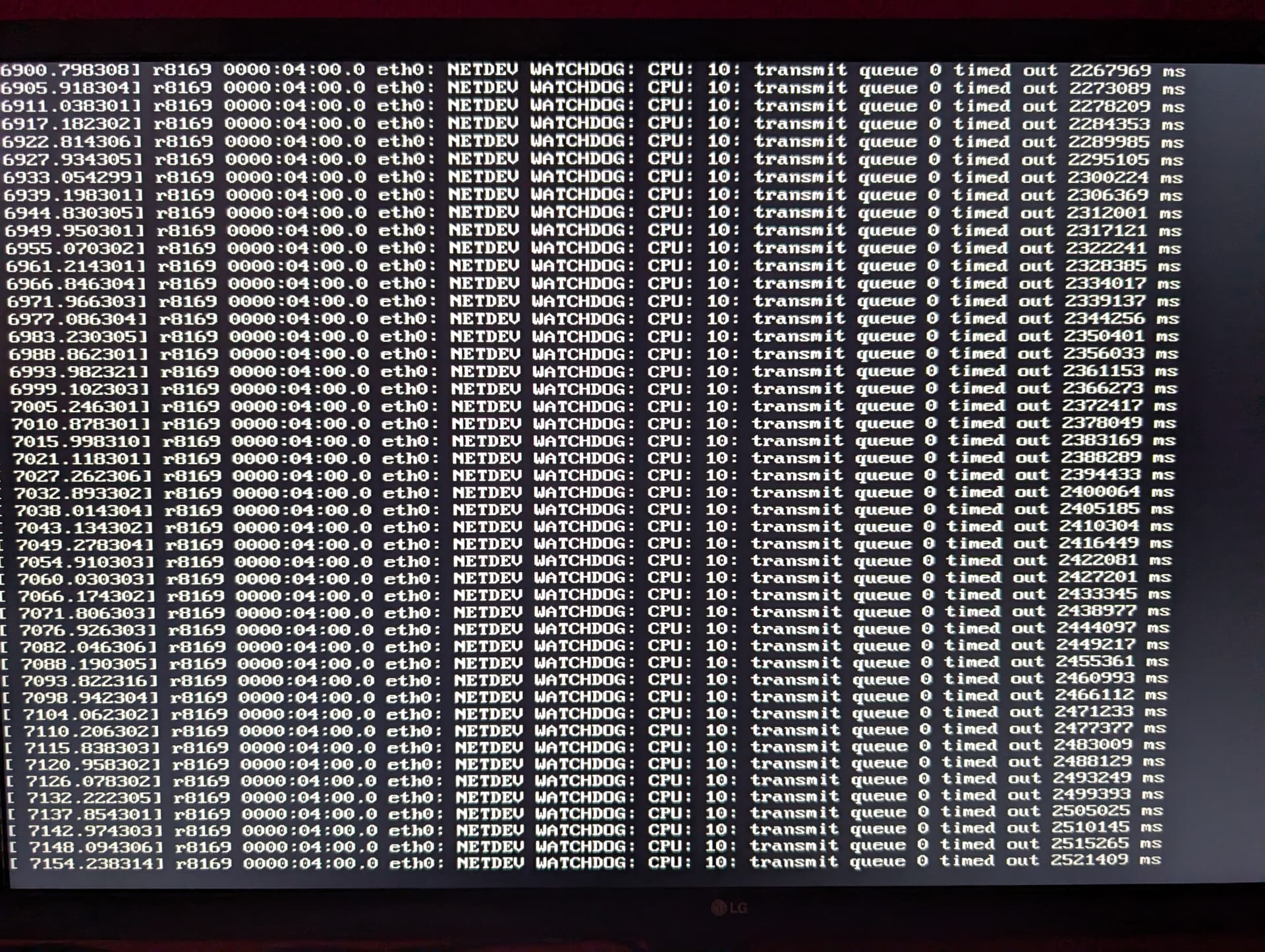 [xxxx.xxxxxx] r8169 0000:04:00.0 eth0: NETDEV WATCHDOG: CPU: 10: transmit queue 0 timed out xxxxxxx ms