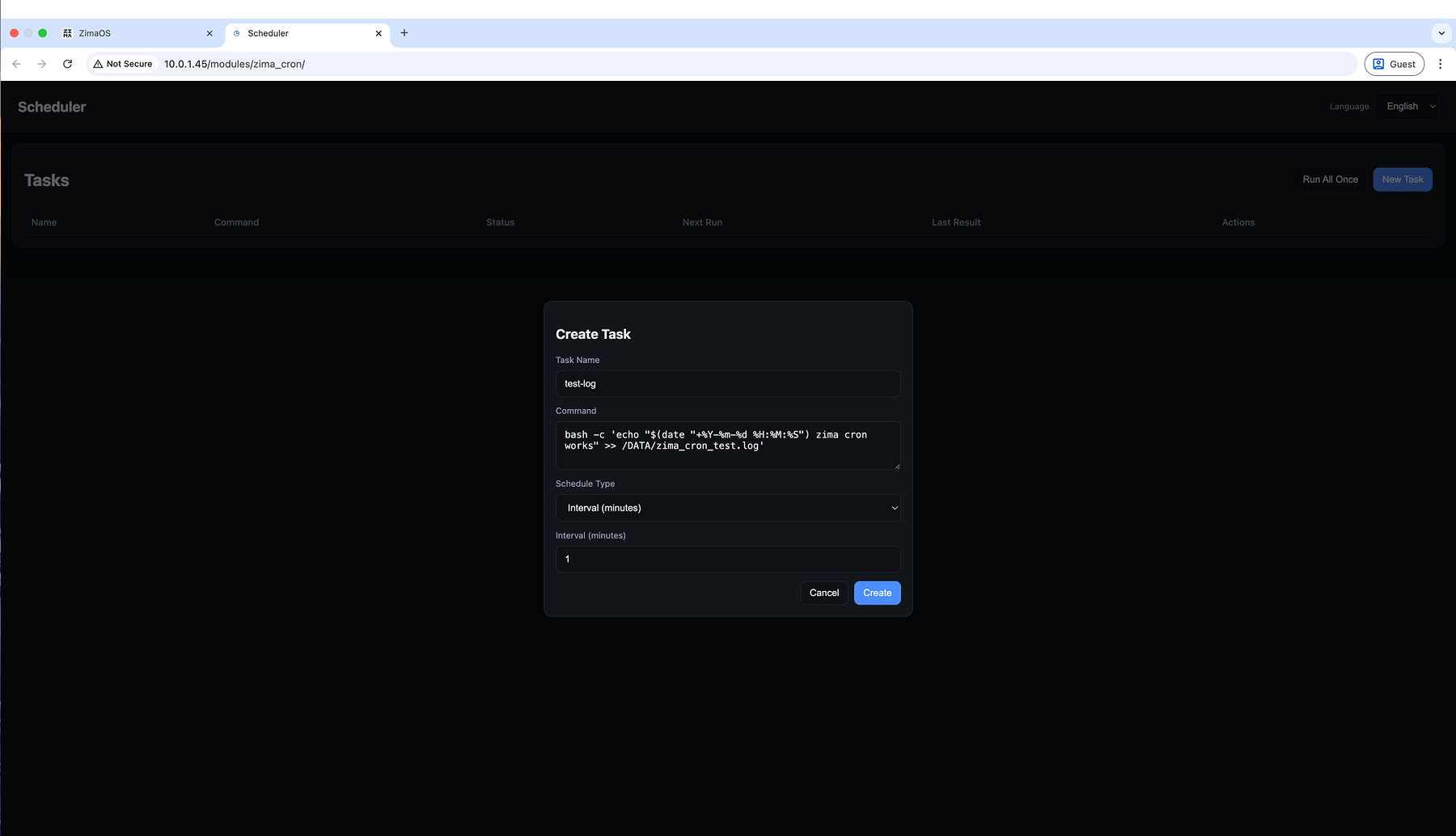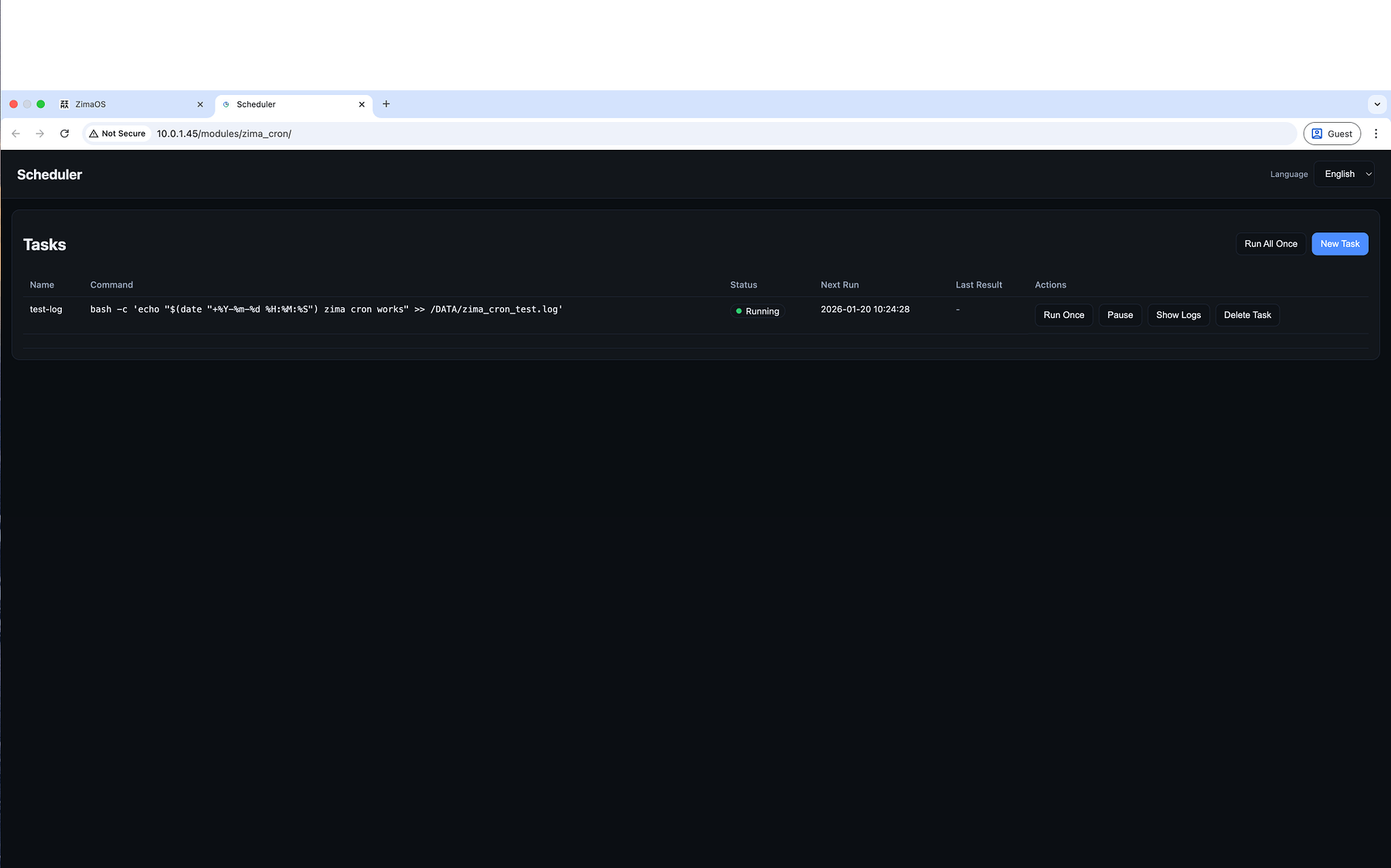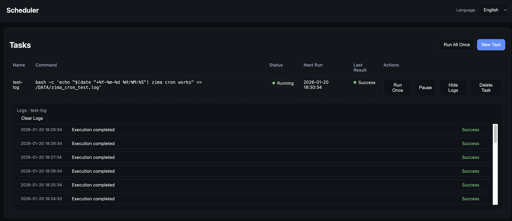 Below is a safe, risk-free test task to verify that Zima Cron is working correctly.