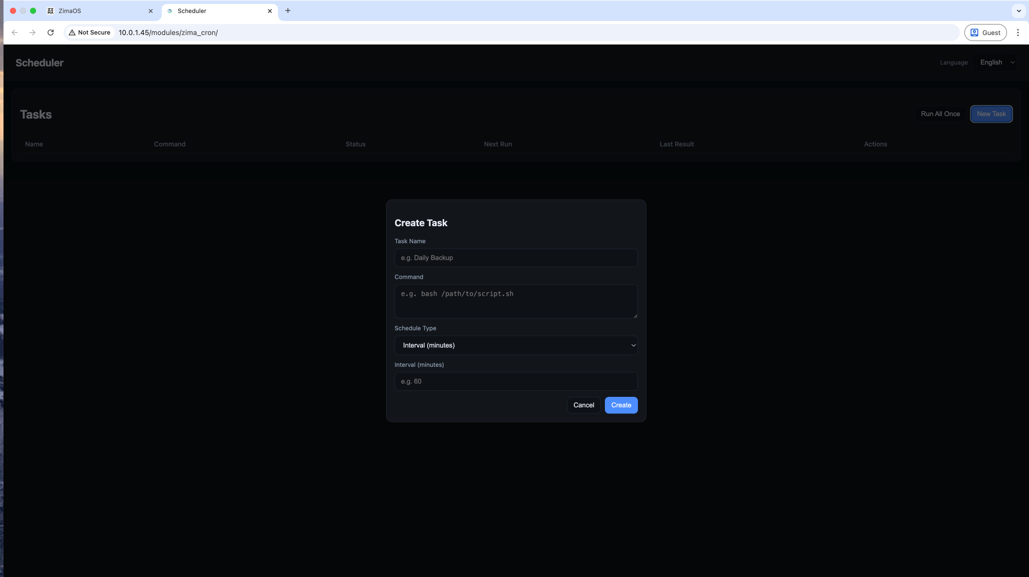 In addition to Interval (minutes) scheduling, Zima Cron also supports Cron Expression scheduling.