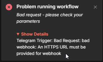 Telegram requires a public HTTPS URL with a valid certificate. Local HTTP or self-signed HTTPS from ZimaOS won’t work as a webhook.