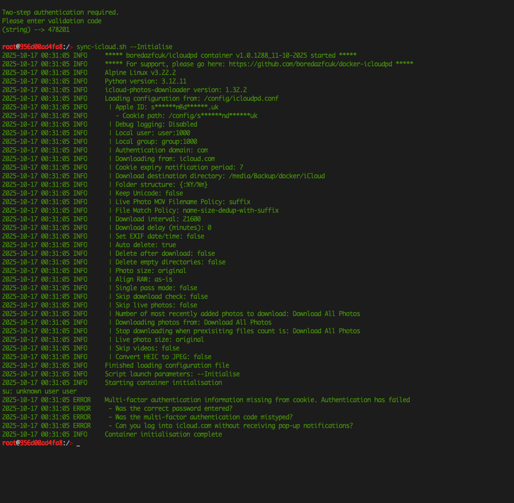 I am stuck on the installation of icloudpd from the docker image boredazfcuk/icloudpd. I am using a Beelink me mini with zimaOS v.1.5