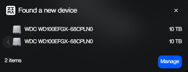 I don’t see the “Start” button here, even though I have my disks connected to my server. My dashboard can find and recognize those devices and are shown as separate “USB” drives. My Google searching tells me that Zima doesn’t allow RAID setups with USB drives, but I was following along to Dammit Jeff’s video “I Spent a Year Replacing My Subscriptions. Here’s How.”, which includes a clip at 19:28 that already has the “Start” button. In that same video, he also uses the same USB DAS setup that I’m using, so I’m not sure what I’m doing wrong or misunderstanding.