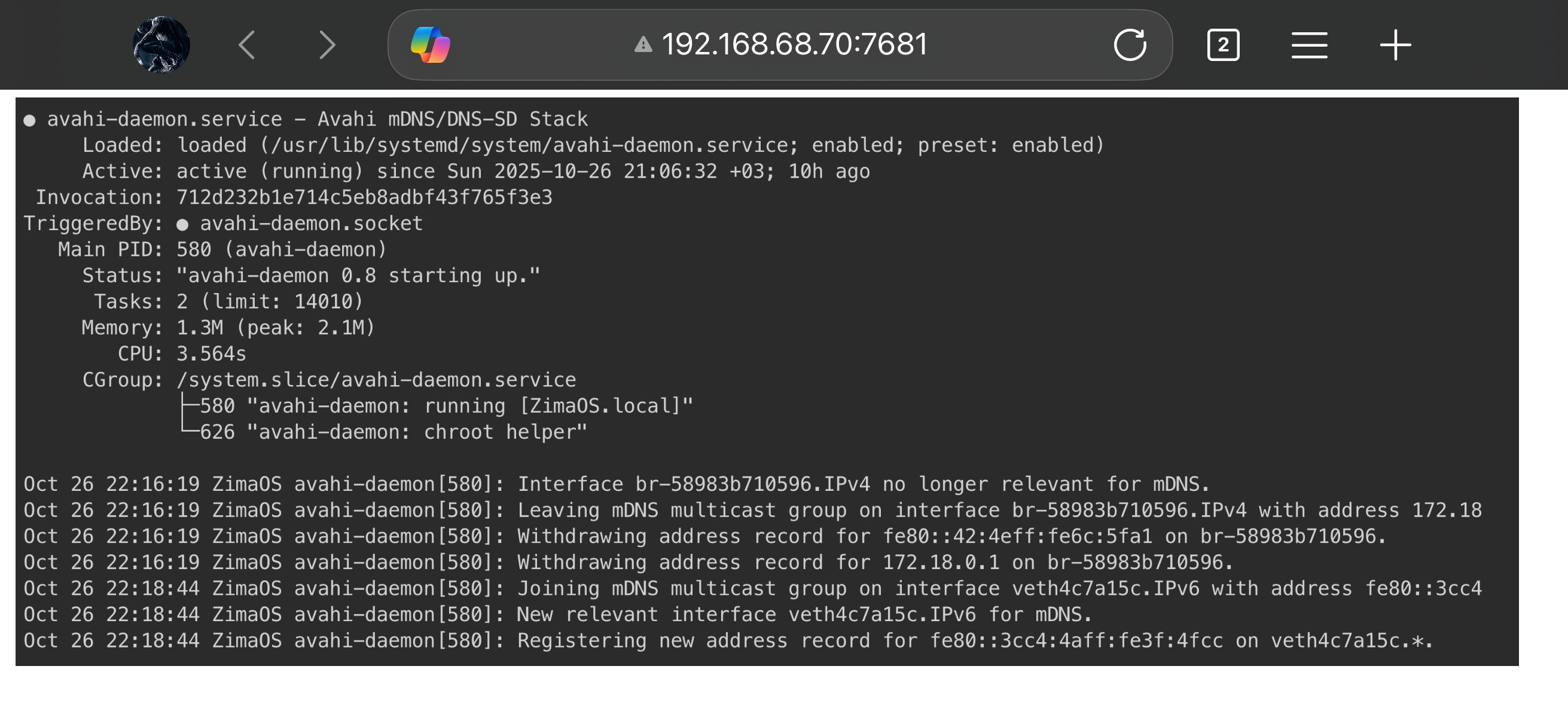 Both sides look fine, Zima Client has Local Network access, and avahi-daemon is running on ZimaOS.