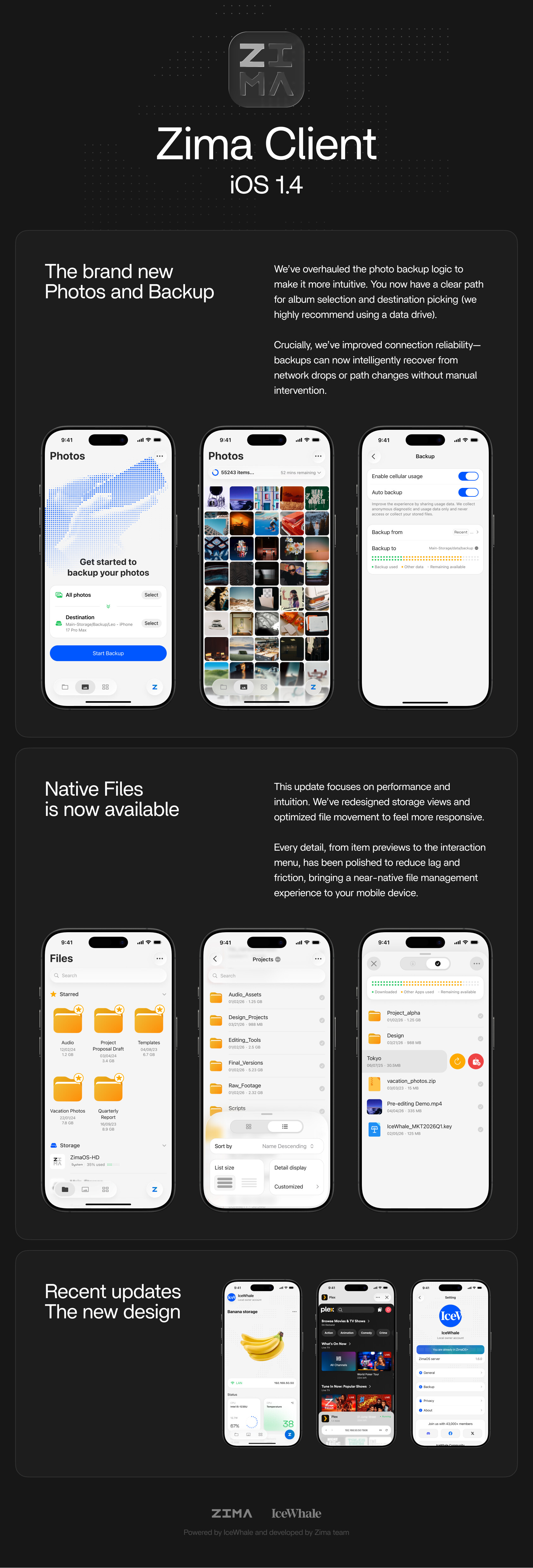 Weβve just rolled out Zima Client v1.4.0, focused on making Files & Backup feel faster, smoother, and more reliable.