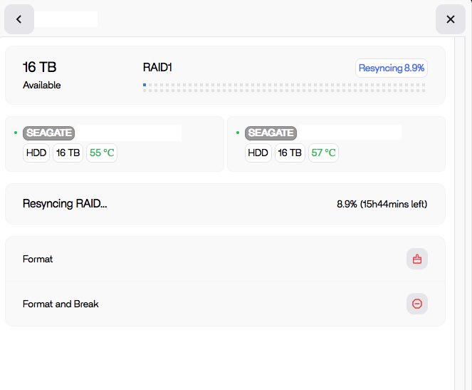 But now I’ve a question: ZimaOS dashboard reports the RAID1 is resyncing. Why? Is this a normal behaviour for a freshly set up RAID1? Note also, by now I also haven’t copied a single bit of my data yet to the RAID.
