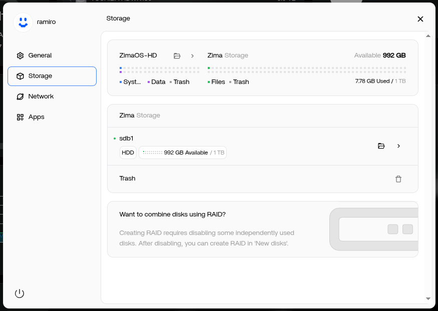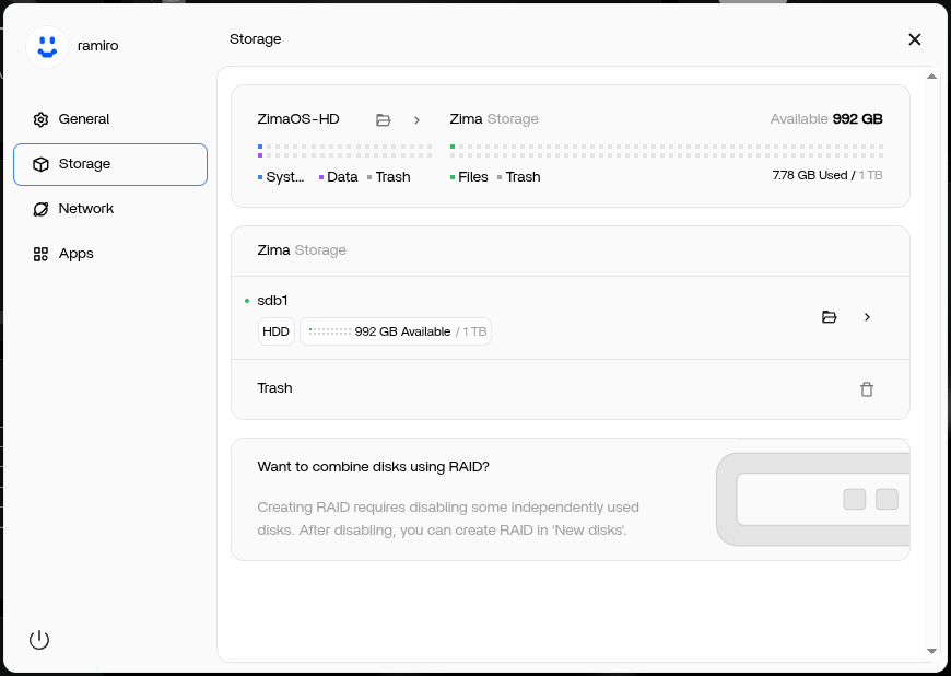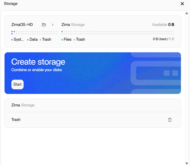Even following these steps, rebooting and letting ZimaOS “rebuild” my dashboard, I still can not create a RAID. But worse now, I can’t see the drives in the Files app nor do they show under the Storage section in settings.