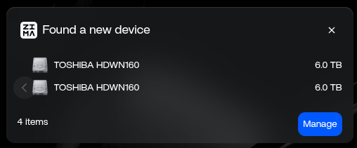 At least you see 3 out of 4 disks. I see none of my four 6 TB hd’s, even tough they appear with “fidsk -l” from within ZimaOS bash shell: