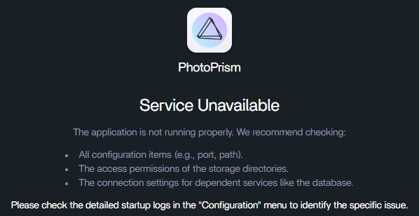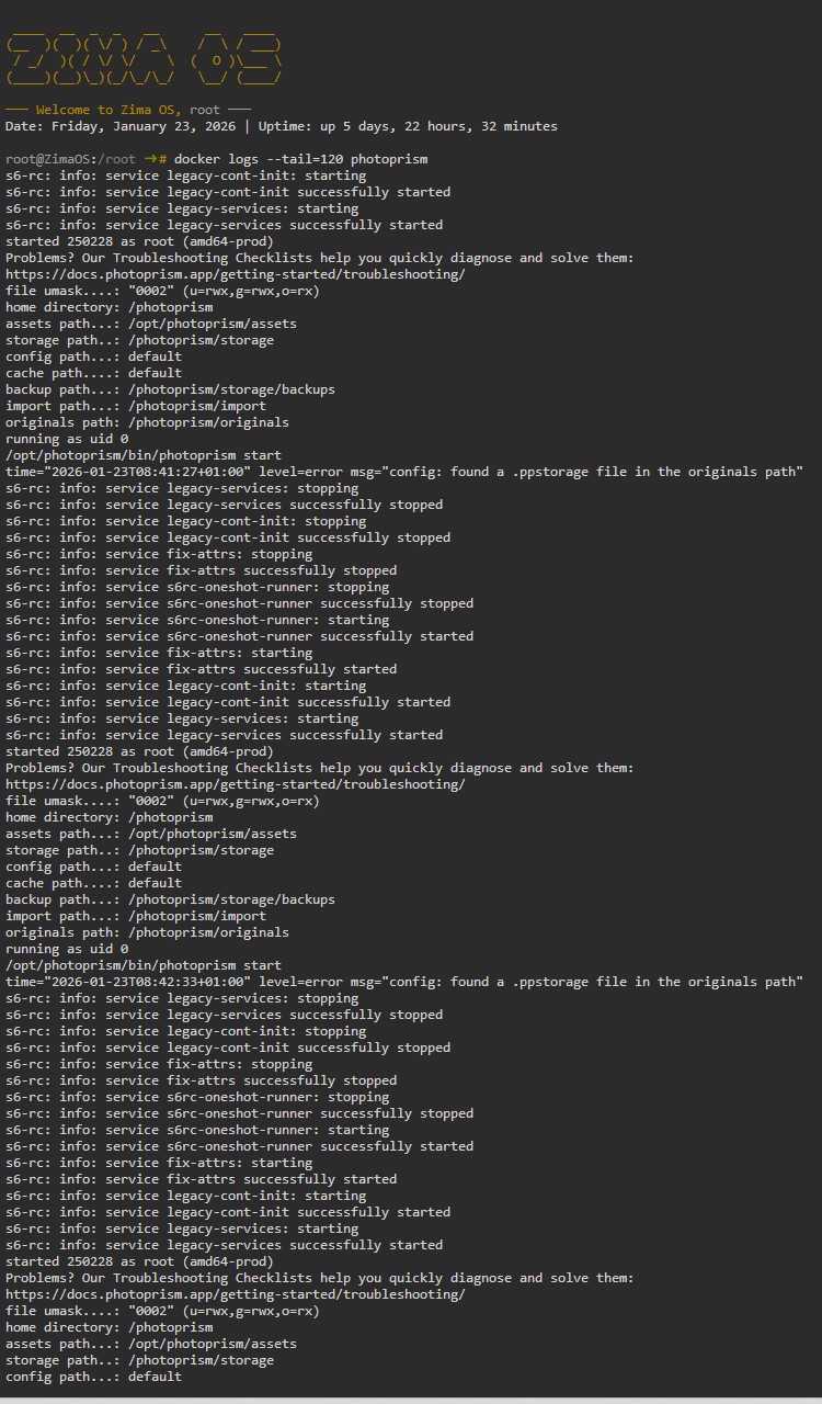I took 3 screenshots, one is the result of “docker logs --tail=120 photoprism” and the other one of the settings in the app itself, I did not change anything (yet). Last one is the notification.