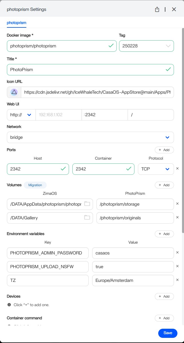 Matter of fact, that one has quite limited setup options but since this is one in the official “ZimaOS Appstore” this one should work.