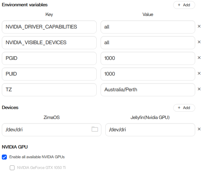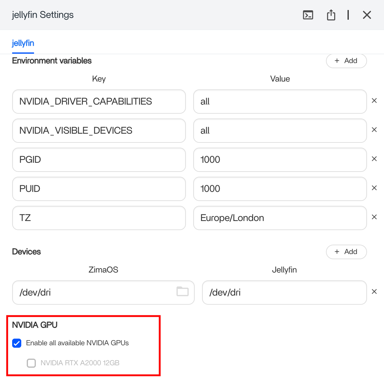 In the Jellyfin container settings of ZimaOS, turn on Nvidia GPU support. As shown below: