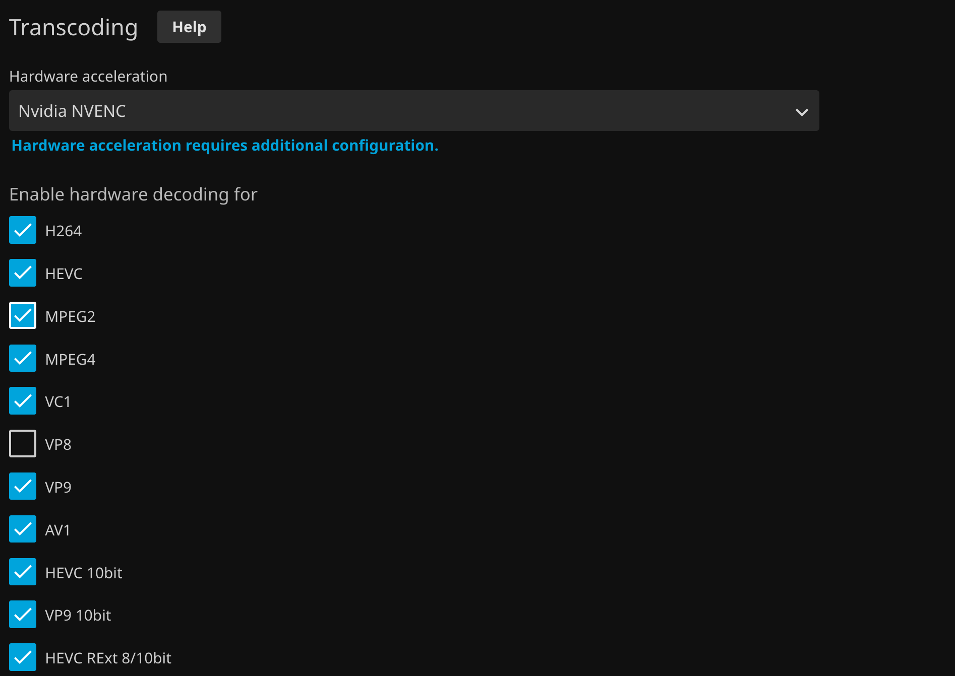 Enable Nvidia NVENC in Jellyfin’s Transcoding, as shown below: