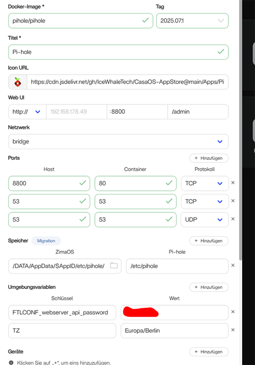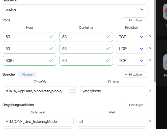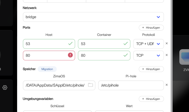 If Pi-hole DHCP is already disabled and your router is doing DHCP, then you’re actually very close, the only thing Pi-hole needs on ZimaOS is port 53 for DNS and port 80 for the web UI. Nothing else.