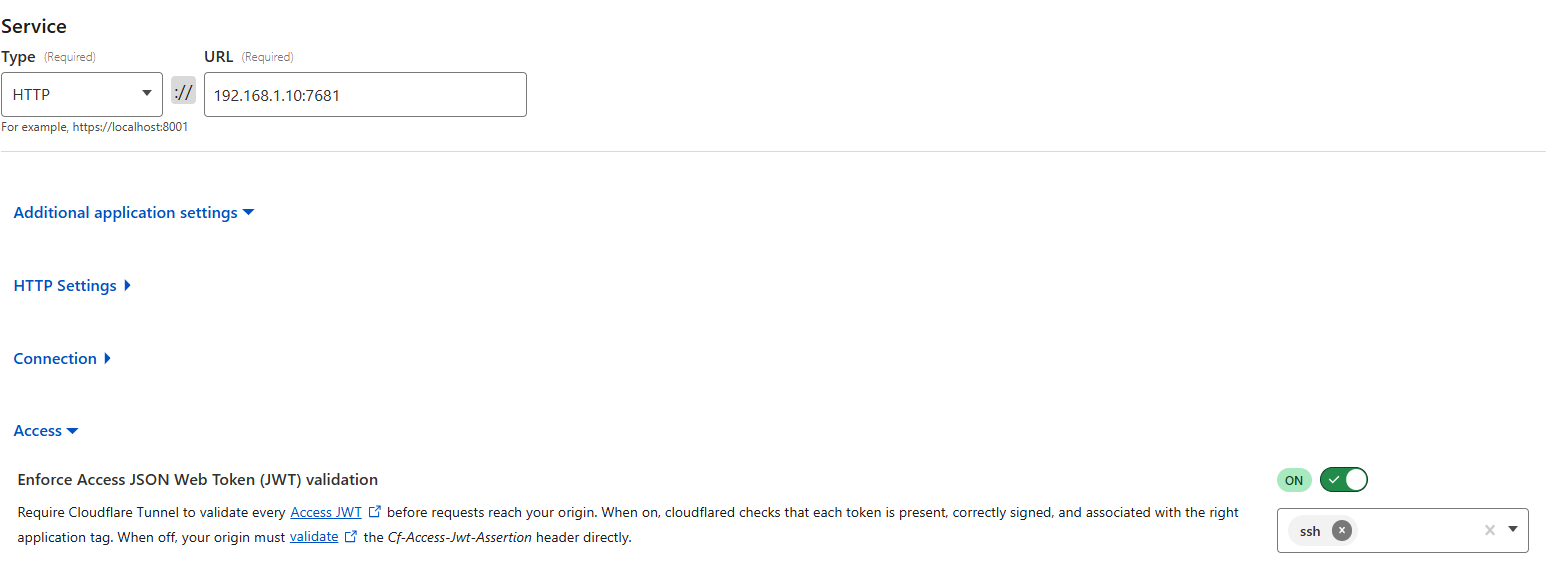 It opens to http://192.168.1.10:7681 (your servers ip) Set that up in Cloudflare