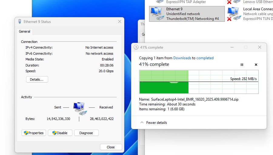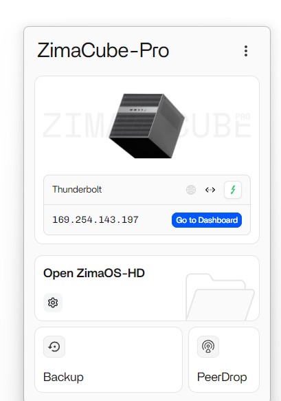 Also, even though the connection speed is marked 20Gbps, transfers via File Explorer are transmitted over Ethernet (2.5Gbps link) and transfers via browser/Zima Dashboard over TB it seems: