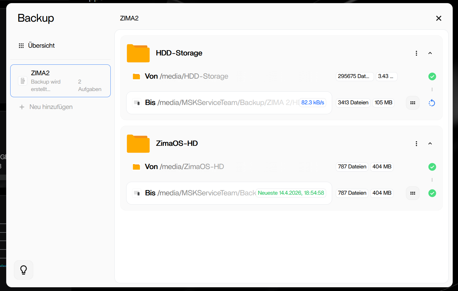 Die Backupfunktion scheine ich nicht zu verstehen, oder sie ist defekt. Ich lege meinen Hauptorder (Safe-Storage) als Quelle an und meine Festplatte in derDS918+ als Ziel. Es werden Daten kopiert, doch das Backup läuft quasi unendlich ohne Erfolgsmeldung. In dem Backupauftrag werden Dateigrößen angezeigt die unmöglich stimmen können. Der Zielordner springt herum, mal 0 Bytes, dann 400GB, oder auch 200TB auf einer 4TB Festplatte. Für die Systemdaten kann ich es nicht beschwören, meine selbst angelegten Ordner sind jedoch alle da. Allerdings sammeln sich immer mehr Daten am Ziel an, eine Synchronisierung scheint es nicht zu geben, es wird offenbar einfach kopiert und nicht abgeglichen.