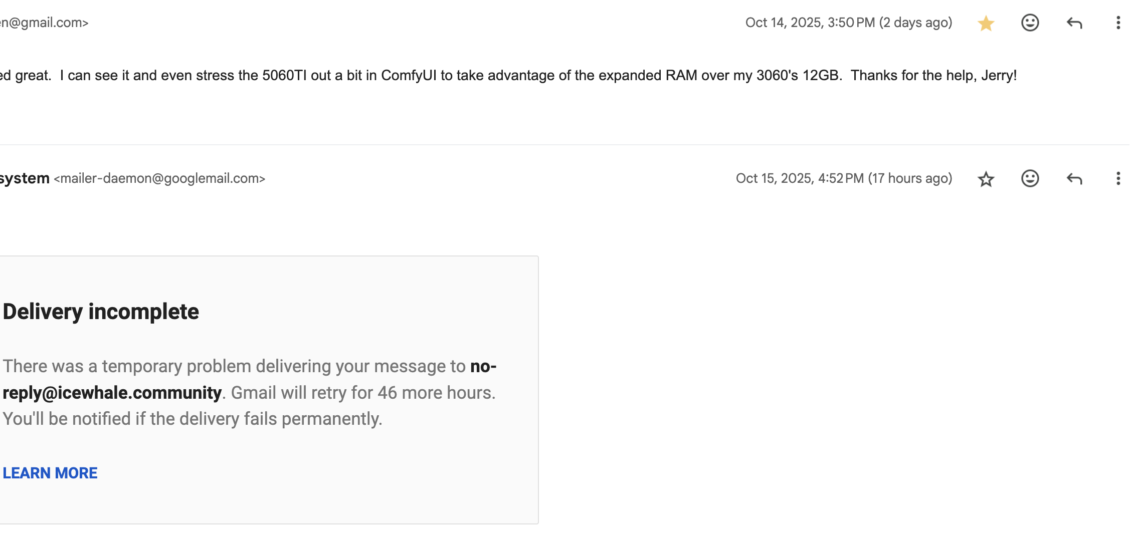 I sent this 2 days ago, but got a bounce back from Icewhale yesterday, so it looks like replies are intermittently failing: