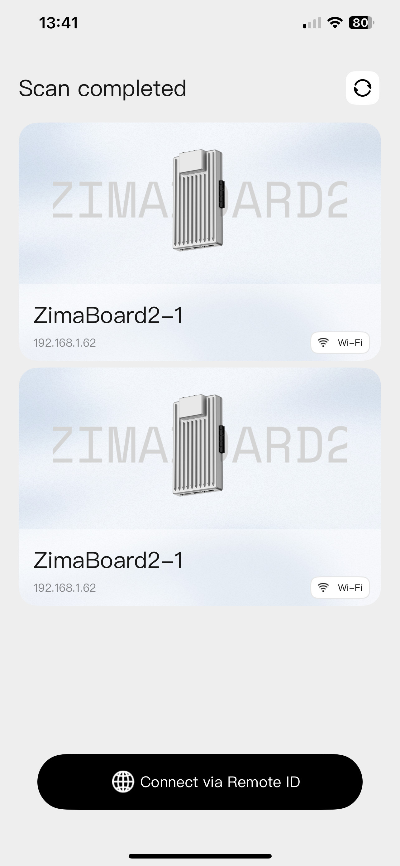 When I start the app, I get to see one of my two units - the name is to be read like that “ZimaBoard2 unit 1” (my second unit is therefore named ZimaBoard2-2). The app shows me a duplicated entry of one and the same unit #1 - identifiable by the name and latest by the same IP address: