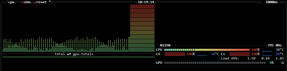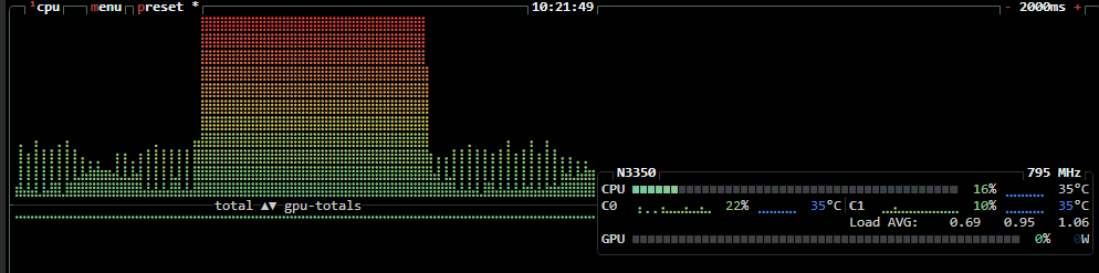 First Image provided shows the CPU jump to 100% when attempting to load one of my image gallery in Jellyfin, and you can also see frequency at 795 MHz. The second image is another one showing low CPU when its finished updating the images in the current page and jumps up to 100% when i’ve moved to the next page in the gallery, then back down to low when it has finished processing the thumbnail images. CPU frequency also changes very slightly between 795 MHz and 796 Mhz during this time.