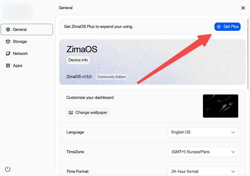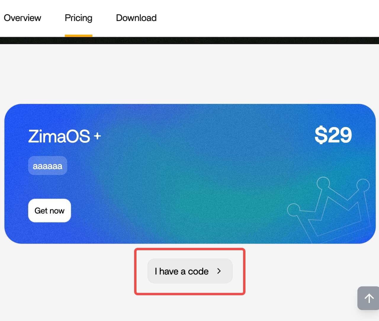 If you’ve already installed ZimaOS, you’ll see a “Get Plus” button in the settings page (as shown in the example). Click it, then choose “I have a code”, and enter your activation code there. The code is permanently valid once activated.