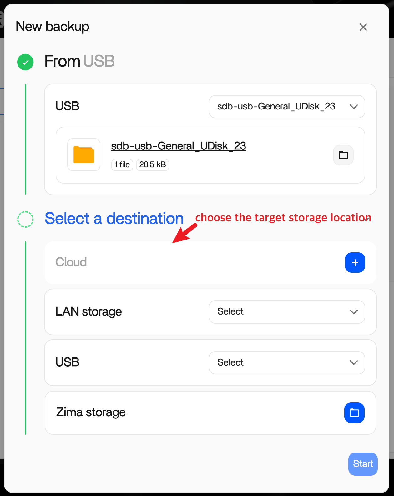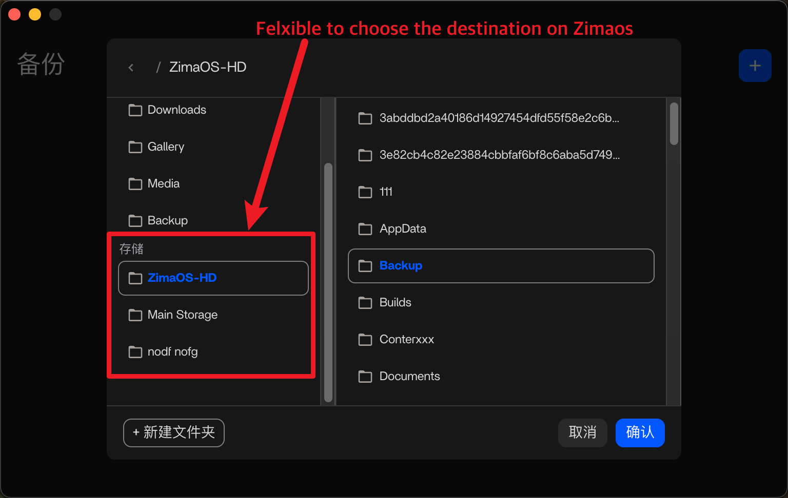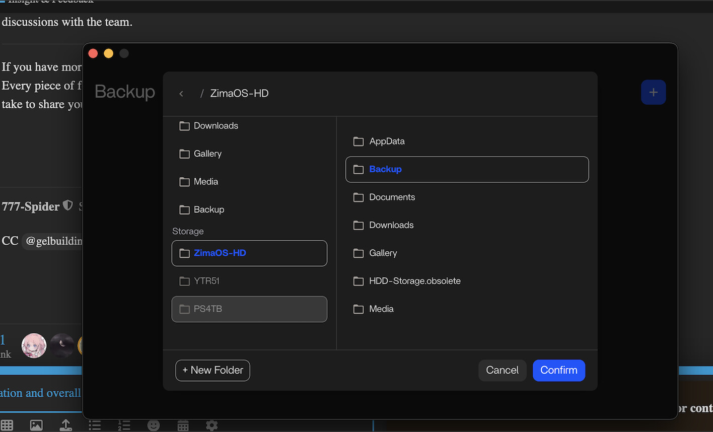 The option to choose which drive to backup against. When choosing a local folder and backing up to ZimaOS, then not only see the Zima device but all that is connected for further control.