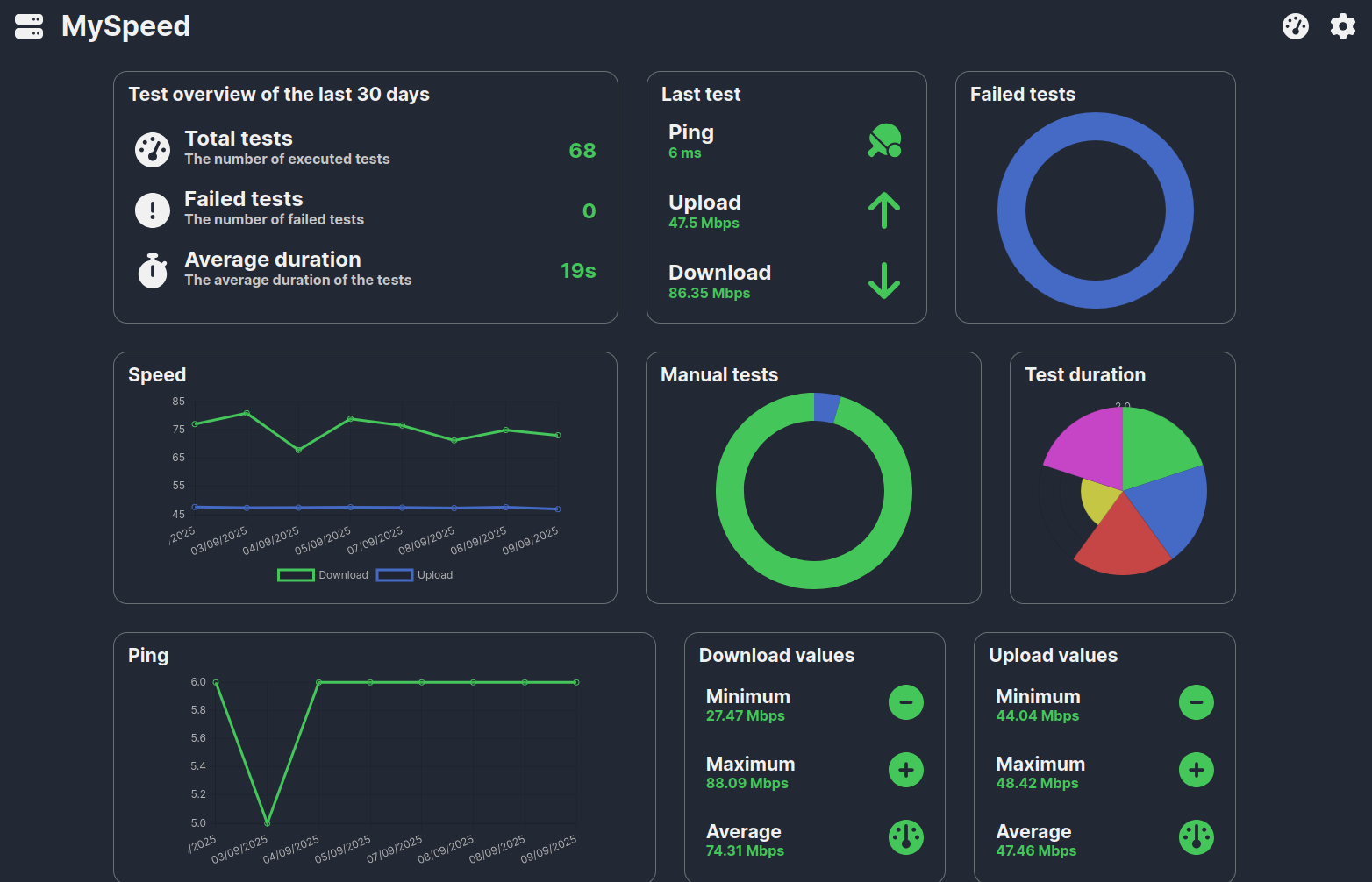 Here are some additional info. I was running myspeed in the same server with all DNS related apps and configurations enabled (Quad9 DNS, Adguard Home, Nginx). Following is the speed check history.