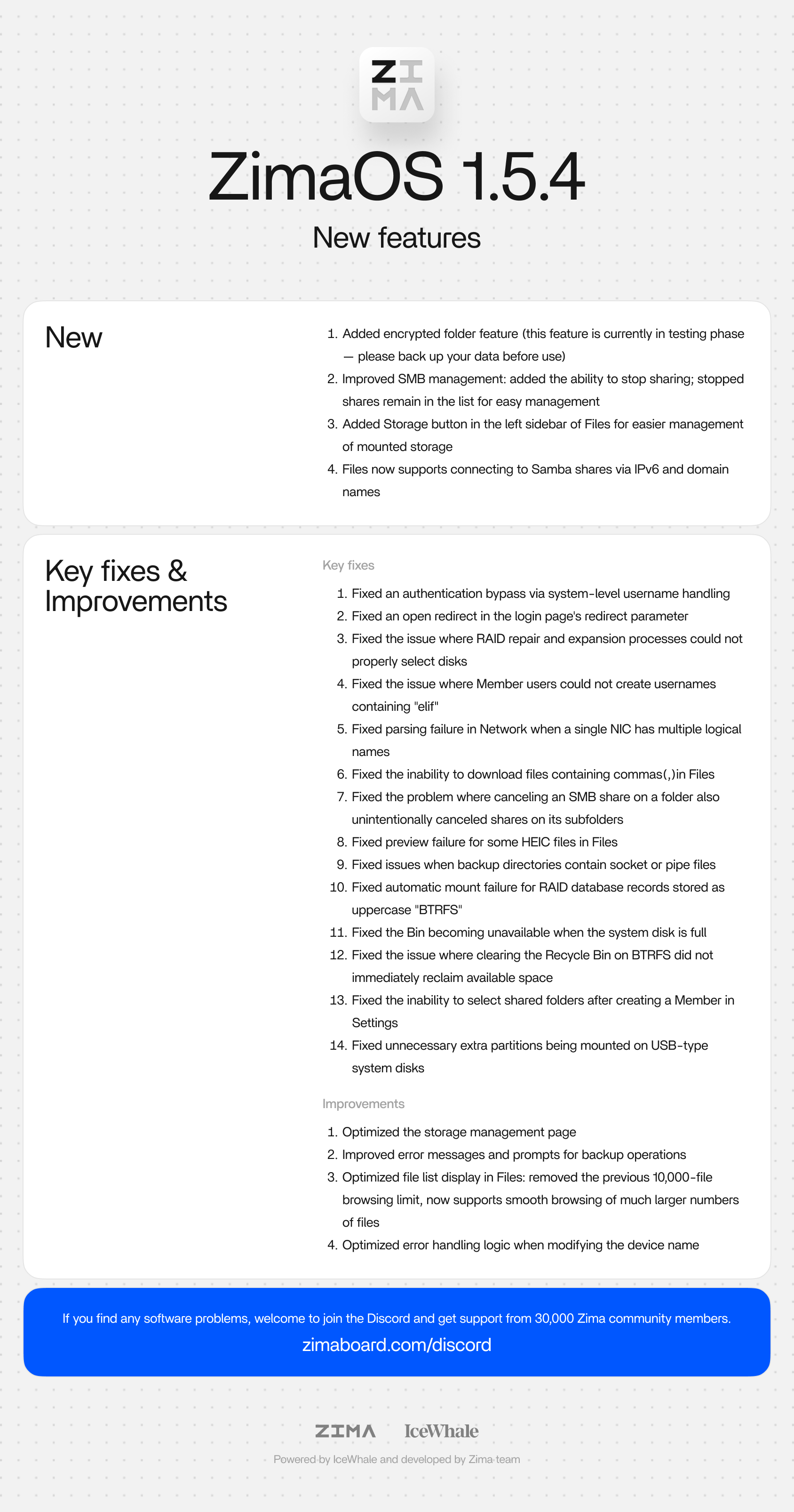 With the official release of ZimaOS v1.5.4, ZimaOS has surpassed 2.9 million total downloads, and the Discord community has grown to over 30,000 members. We sincerely thank every user and developer for your continued support and valuable feedback ![]()